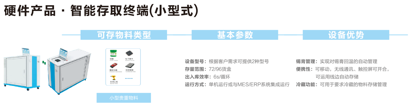 小型一對一智能存取終端,可實現(xiàn)對錫膏回溫的自動管理,可移動,無線通訊、觸控屏可開會,可運用線邊自動存儲。可用于要求冷藏的物料存儲管理。