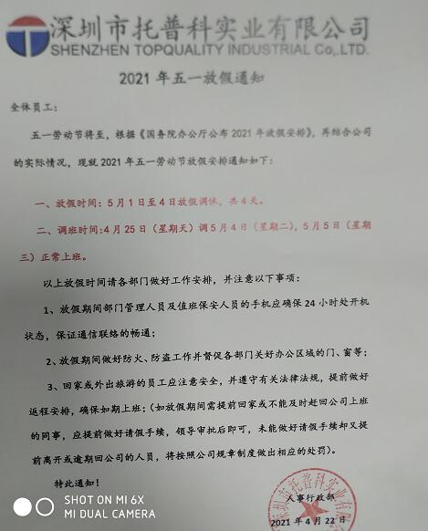 放假時間:5月1日至5月4日,5月5日正常上班共4天;