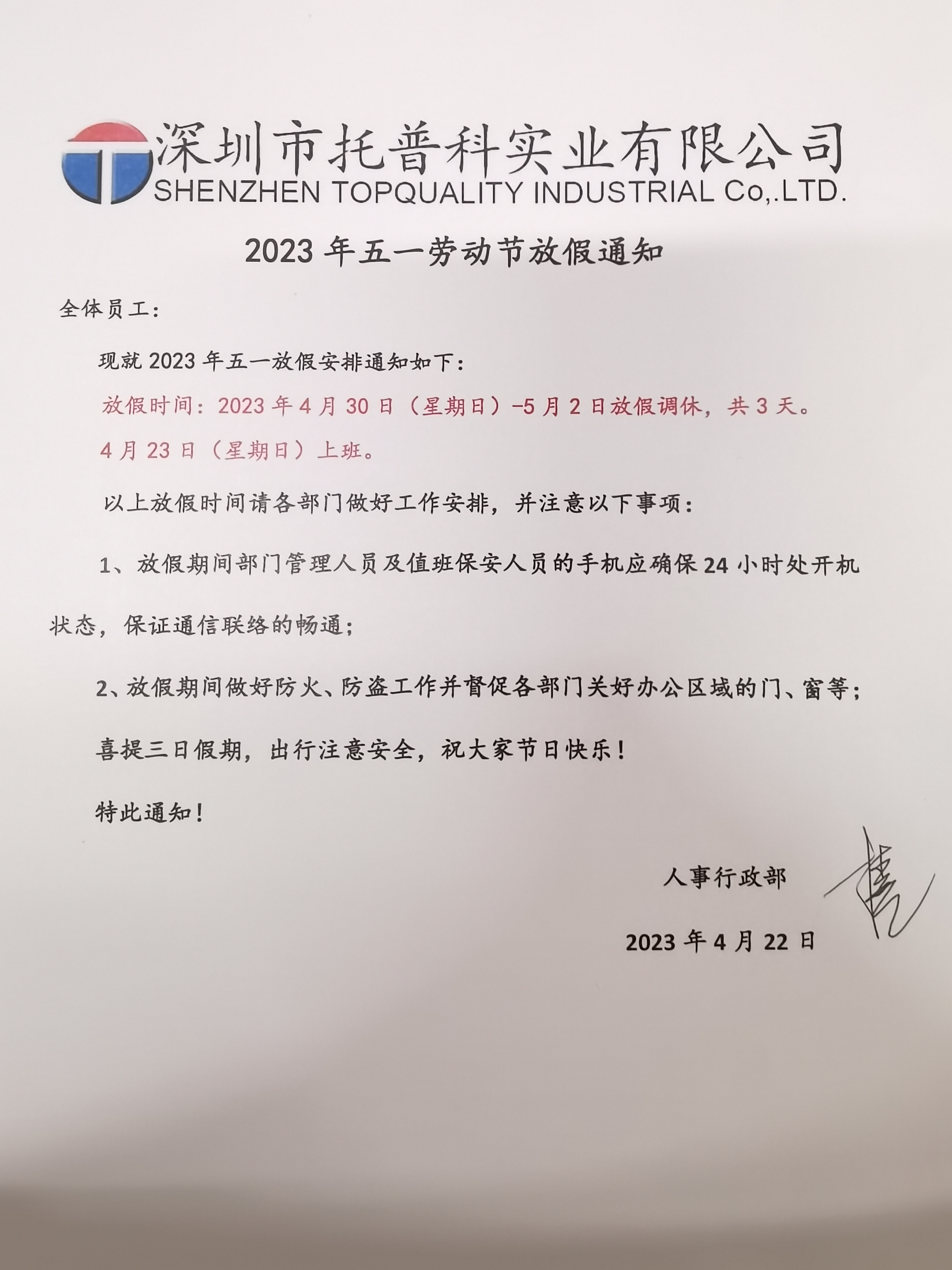 2023年五一勞動節(jié)即將臨近,根據(jù)公司實際生產(chǎn)經(jīng)營情況以及國家有關(guān)五一勞動節(jié)放假安排,現(xiàn)公布2023年深圳托普科實業(yè)五一勞動節(jié)放假通知: