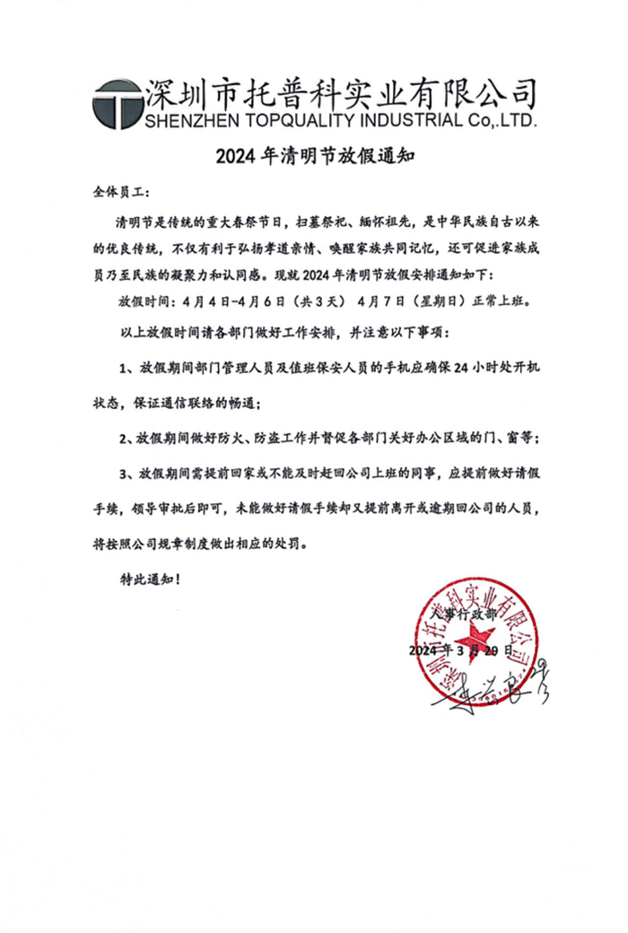清明節放假時間:根據公司實際情況,我公司清明放假時間為2024年4月4日--2024年4月6日(周四、周五、周六)共3天,2024年4月7日(周日)正常上班。